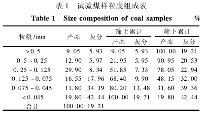 试验所用煤样为官地选煤厂精煤磁尾,按照 《煤样的制备方法》 ( GB 474—1996) 的要求制成 试验用煤样。为了考察煤样各粒度级的产率和灰 分,根据中华人民共和国煤炭行业标准 《煤粉筛分试验方法》 ( MT/T 58—1993) ,采用振动筛筛孔为 0. 5、0. 25、0. 125、0. 074、0. 045 mm 的标准套筛对该煤样进行了粒度分析,结果见表 1