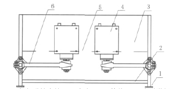 1—机架弹性支撑; 2—机架; 3—筛体; 4—电磁激振器;5—筛网; 6—电磁激振臂