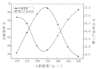 煤浆浓度对分级效率及筛上产品灰分的影响规 律见图 2。
