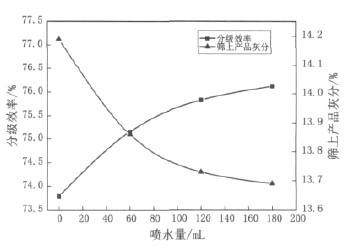 由图 5 中可以看出,随着喷水量的增加,分级 效率逐渐变大,筛上产品灰分逐渐降低,但变化都 有变缓的趋势。这是因为在筛分过程进行时,只是 增加喷水量对筛上物料的松散分层没有太大的影 响,必须要有持续的喷水。正如德瑞克细筛配置有 1 ~ 3 个洗矿槽,为使前一筛网已脱水的筛上产品 在洗矿槽再造浆,喷淋装置直接向洗矿槽喷水,可 以使筛上物在洗矿槽重新造浆,固体颗粒彻底翻转 和碎散,再经筛分使粗、细物料分离 [15] 。电磁高 频细筛是通过击打筛网使物料松散,在有持续喷水 的条件下,在筛面上即可完成重新造浆,使粗、细 物料分离开来。