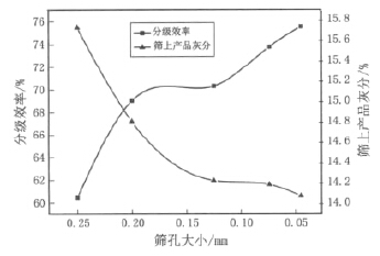 筛孔大小对分级效率及筛上产品灰分的影响规 律见图 4。
