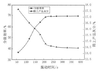 在电磁高频振动筛筛分试验过程中,振动时间对 筛分分级效果的影响如图 3 所示。