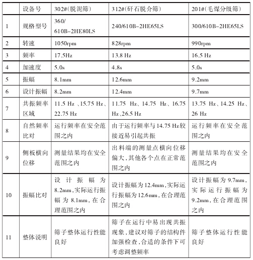 选煤厂重介末矸脱介筛规格型号为 BRU-1-240/ 610B-2HE65LS,在设备启停过程中,明显感觉筛箱振幅较大, 现场目测振幅大约在13mm,2009年下半年筛子的一根支撑弹簧断裂。2010年5月公司相关部门技术人员到选煤 厂对302#脱泥筛、312#矸石脱介筛和201#毛煤分级筛进行了一 次全面的结构技术测评,测评数据与整体说明统计如下